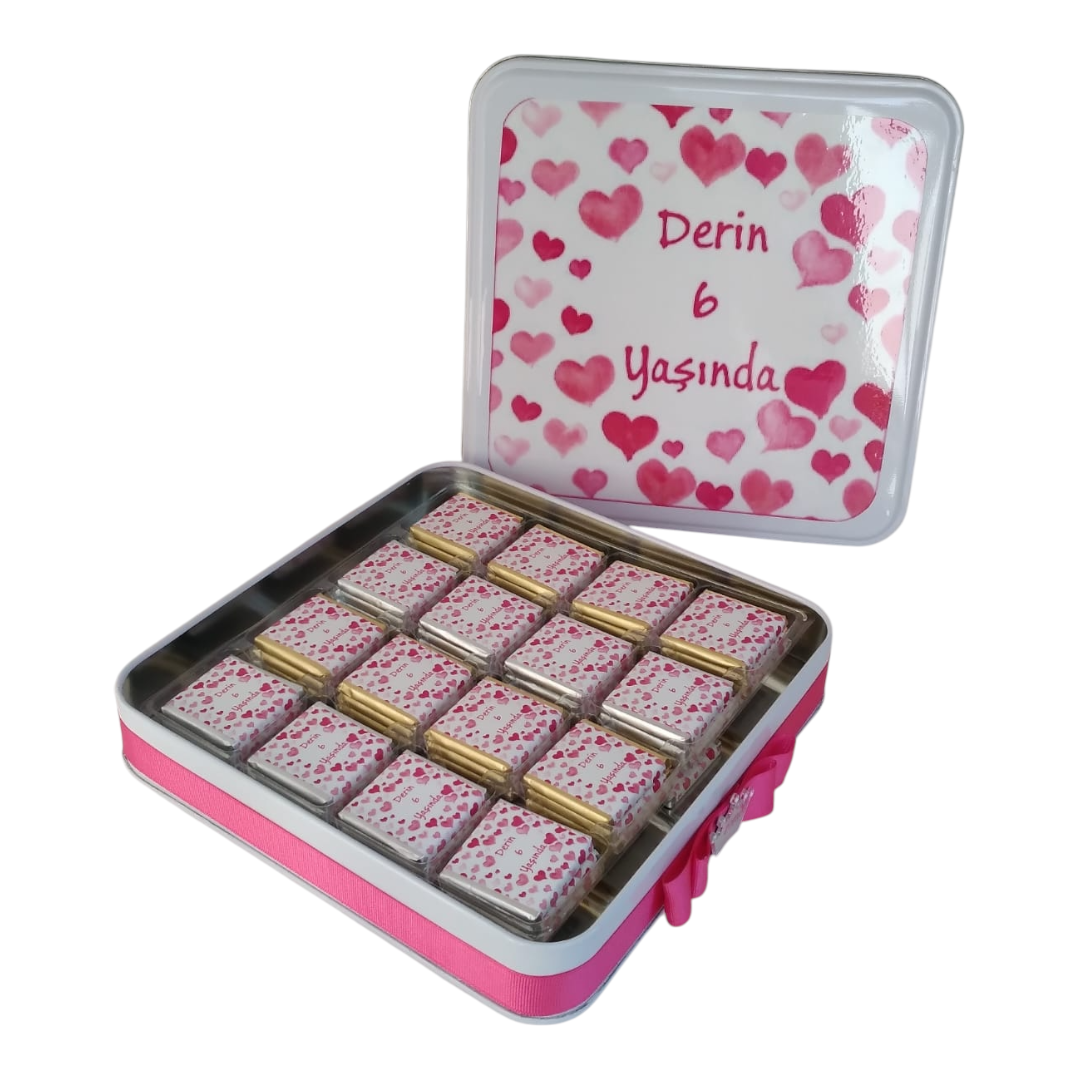 KARE METAL KUTUDA Kalp KISIYE OZEL ISIMLI DOGUM GUNU CIKOLATASI